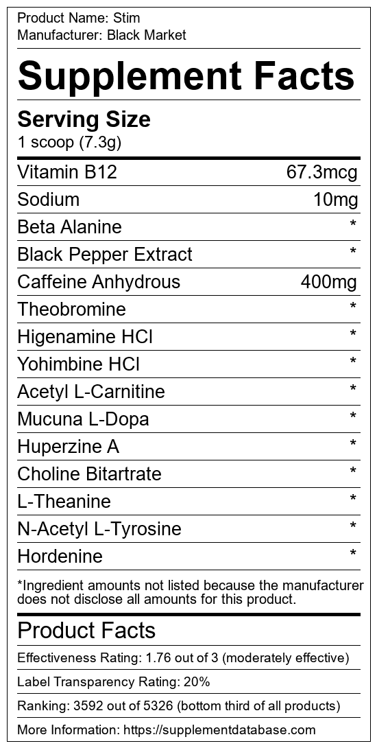 Stim is a pre-workout supplement manufactured by Black Market. It ranks 1,429 out of 1,898 pre-workout supplements and earned an overall thumbs-down recommendation based on seven factors including nutrition label transparency, ingredients, dosing, claims, research rating, and ranking.