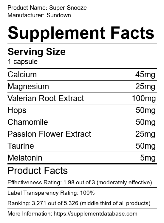 Super Snooze is a sleep aid manufactured by Sundown. It ranks 185 out of 215 sleep aids and earned an overall thumbs-down recommendation based on seven factors including nutrition label transparency, ingredients, dosing, claims, research rating, and ranking.