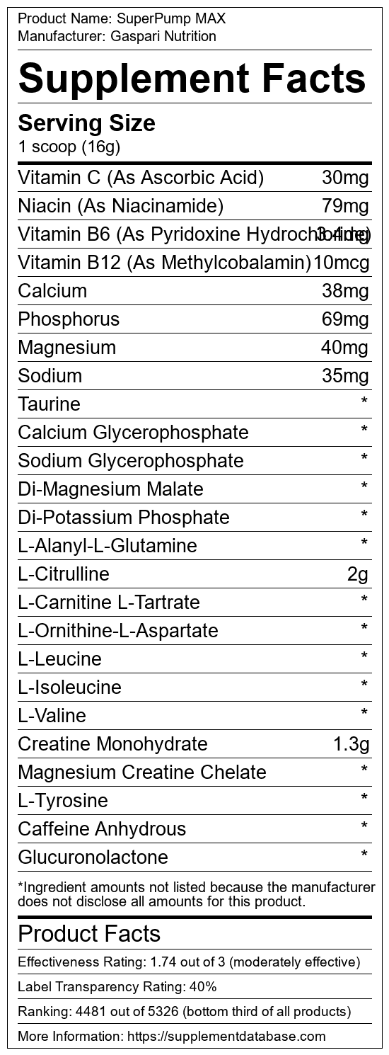 SuperPump MAX is a pre-workout supplement manufactured by Gaspari Nutrition. It ranks 1,773 out of 1,898 pre-workout supplements and earned an overall thumbs-down recommendation based on seven factors including nutrition label transparency, ingredients, dosing, claims, research rating, and ranking.