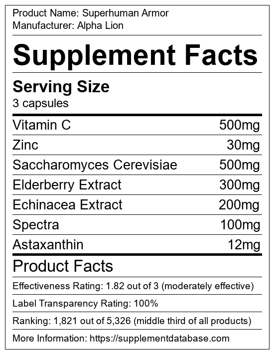 Superhuman Armor is an immune system booster manufactured by Alpha Lion. It ranks 8 out of 72 immune system boosters and earned an overall thumbs-up recommendation based on seven factors including nutrition label transparency, ingredients, dosing, claims, research rating, and ranking.