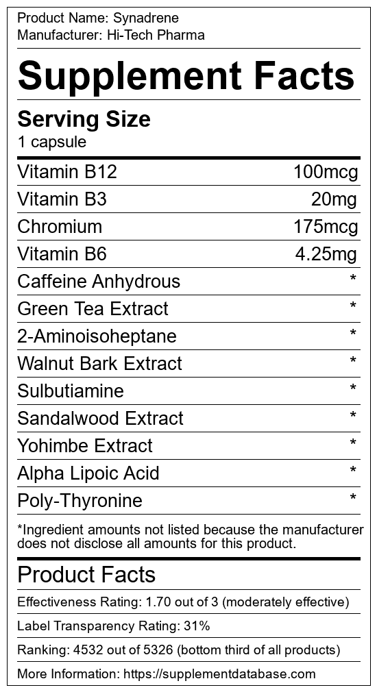 Synadrene is a fat burning supplement manufactured by Hi-Tech Pharma. It ranks 629 out of 719 fat burning supplements and earned an overall thumbs-down recommendation based on seven factors including nutrition label transparency, ingredients, dosing, claims, research rating, and ranking.