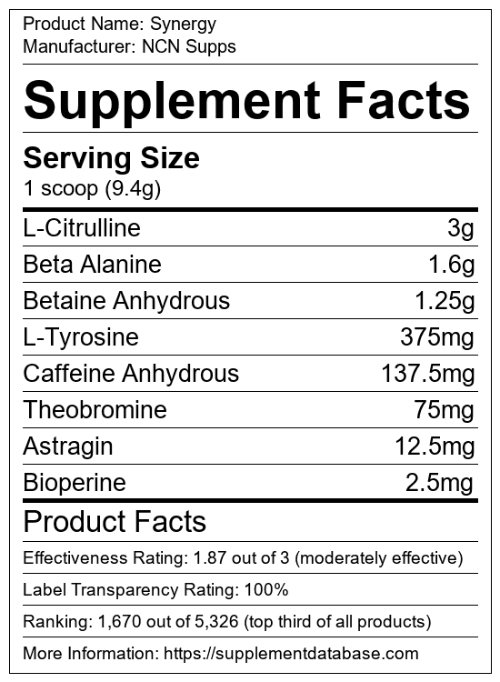 Synergy is a pre-workout supplement manufactured by NCN Supps. It ranks 743 out of 1,898 pre-workout supplements and earned an overall thumbs-up recommendation based on seven factors including nutrition label transparency, ingredients, dosing, claims, research rating, and ranking.