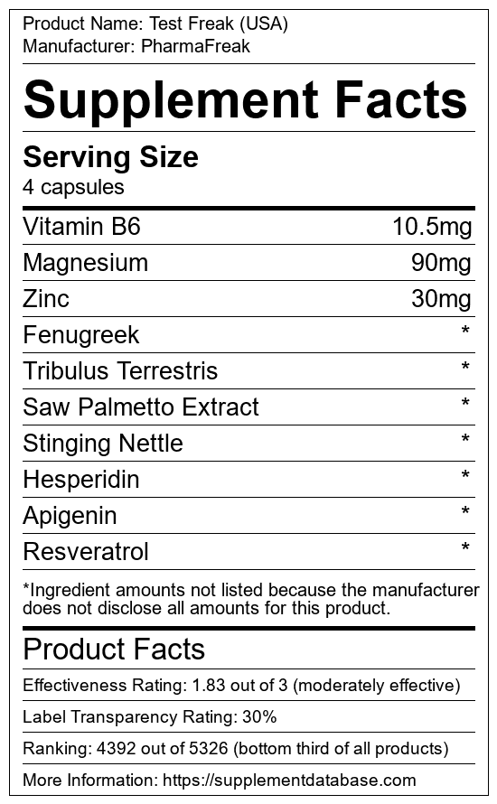 Test Freak (USA) is a testosterone booster manufactured by PharmaFreak. It ranks 254 out of 321 testosterone boosters and earned an overall thumbs-down recommendation based on seven factors including nutrition label transparency, ingredients, dosing, claims, research rating, and ranking.