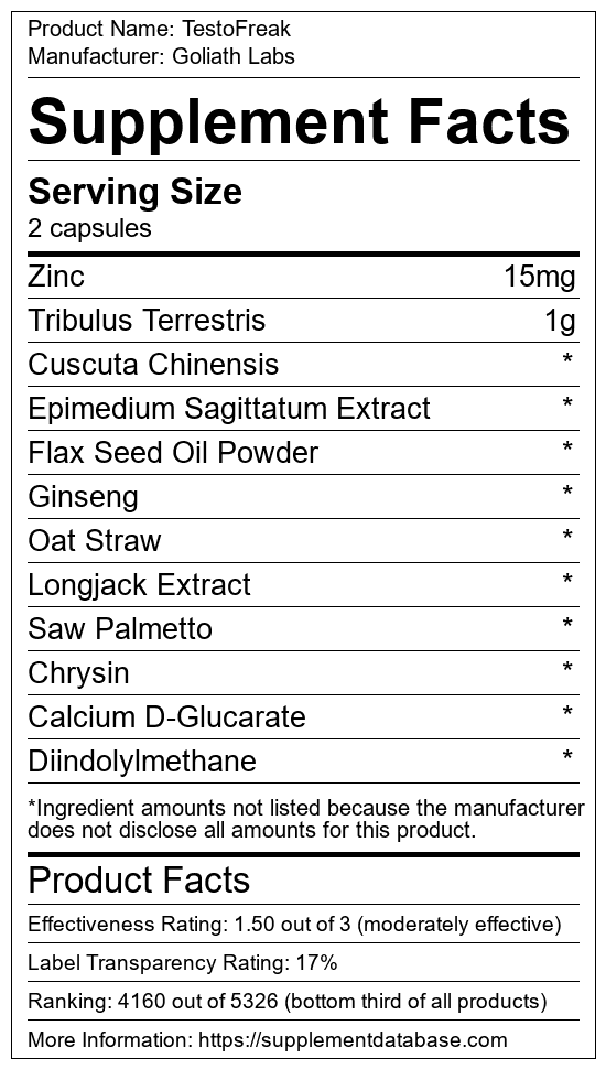 TestoFreak is a testosterone booster manufactured by Goliath Labs. It ranks 232 out of 321 testosterone boosters and earned an overall thumbs-down recommendation based on seven factors including nutrition label transparency, ingredients, dosing, claims, research rating, and ranking.