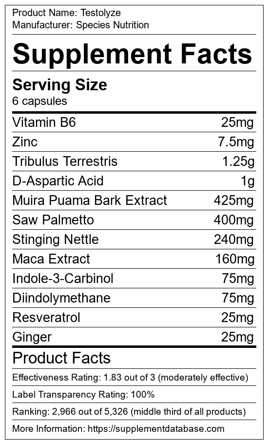 Testolyze is a testosterone booster manufactured by Species Nutrition. It ranks 121 out of 321 testosterone boosters and earned an overall thumbs-down recommendation based on seven factors including nutrition label transparency, ingredients, dosing, claims, research rating, and ranking.