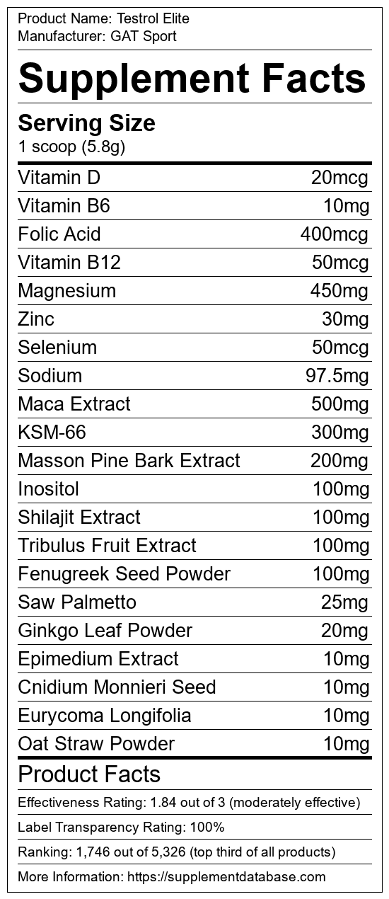 Testrol Elite is a testosterone booster manufactured by GAT Sport. It ranks 29 out of 321 testosterone boosters and earned an overall thumbs-up recommendation based on seven factors including nutrition label transparency, ingredients, dosing, claims, research rating, and ranking.