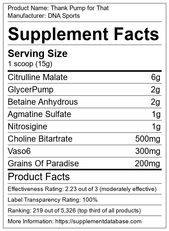 Thank Pump for That is a pump supplement manufactured by DNA Sports. It ranks 35 out of 322 pump supplements and earned an overall thumbs-up recommendation based on seven factors including nutrition label transparency, ingredients, dosing, claims, research rating, and ranking.