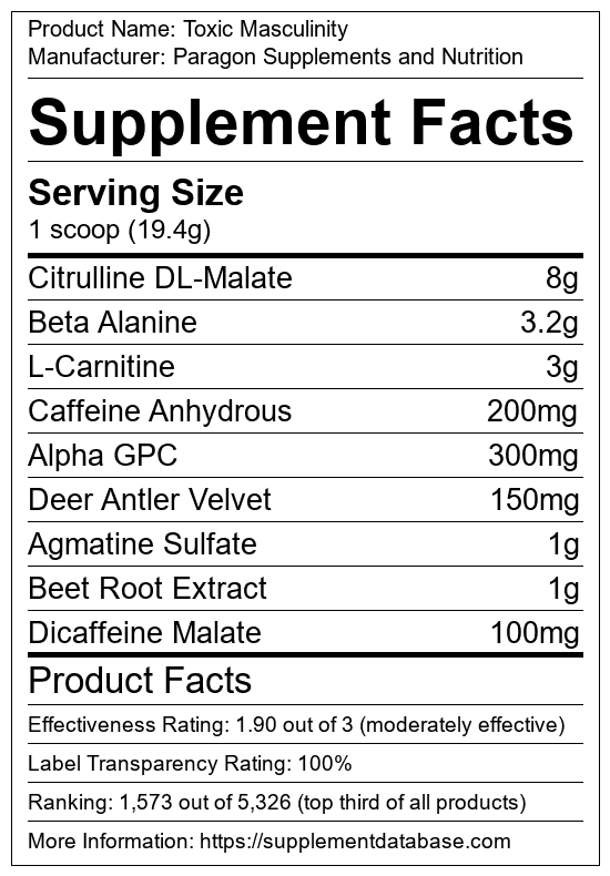 Toxic Masculinity is a pre-workout supplement manufactured by Paragon Supplements and Nutrition. It ranks 700 out of 1,898 pre-workout supplements and earned an overall thumbs-up recommendation based on seven factors including nutrition label transparency, ingredients, dosing, claims, research rating, and ranking.