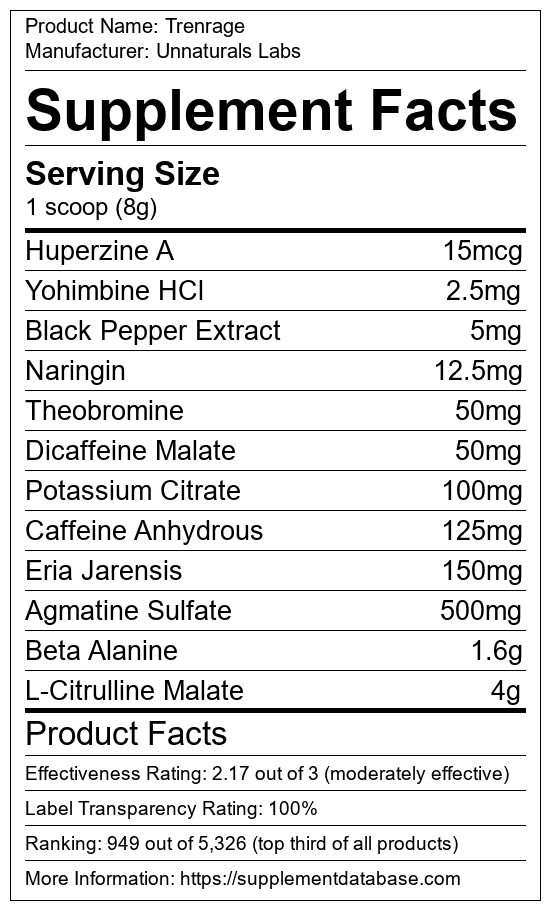 Trenrage is a pre-workout supplement manufactured by Unnaturals Labs. It ranks 426 out of 1,898 pre-workout supplements and earned an overall thumbs-up recommendation based on seven factors including nutrition label transparency, ingredients, dosing, claims, research rating, and ranking.