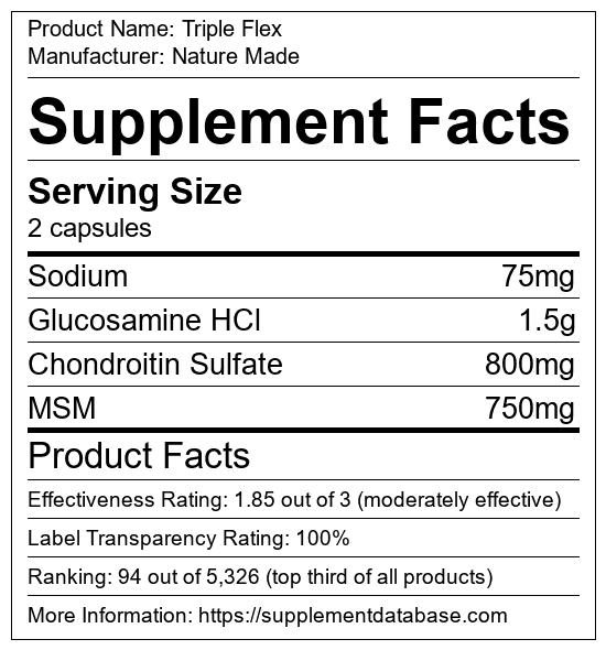 Triple Flex earned a thumbs-up in this category because its effectiveness rating is 1.85. A product's effectiveness rating must be at least 1.5 to receive a thumbs-up in this area. This effectiveness rating means Triple Flex is made up of a mix of both high and low-quality ingredients and may lead to some positive results.