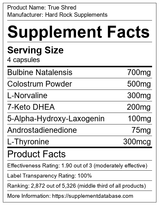 True Shred is a fat burning supplement manufactured by Hard Rock Supplements. It ranks 334 out of 719 fat burning supplements and earned an overall thumbs-down recommendation based on seven factors including nutrition label transparency, ingredients, dosing, claims, research rating, and ranking.