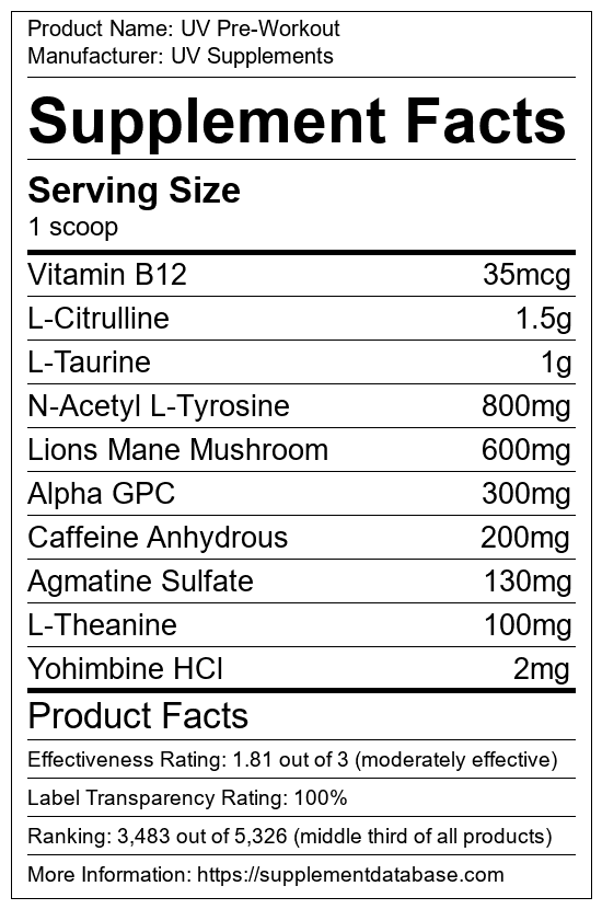 UV Pre-Workout ranks 1,362 out of 1,898 in the Pre-Workout Supplements category and 3,941 out of 5,326 in the entire database. The table below lists comparisons with similarly ranked pre-workout supplement. Click on a link for an in-depth comparison between the two.