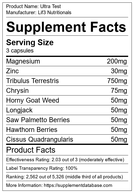 Ultra Test is a testosterone booster manufactured by Lif3 Nutritionals. It ranks 74 out of 321 testosterone boosters and earned an overall thumbs-down recommendation based on seven factors including nutrition label transparency, ingredients, dosing, claims, research rating, and ranking.