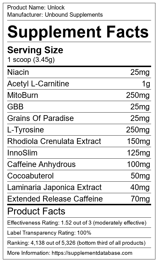 Unlock is a fat burning supplement manufactured by Unbound Supplements. It ranks 567 out of 719 fat burning supplements and earned an overall thumbs-down recommendation based on seven factors including nutrition label transparency, ingredients, dosing, claims, research rating, and ranking.