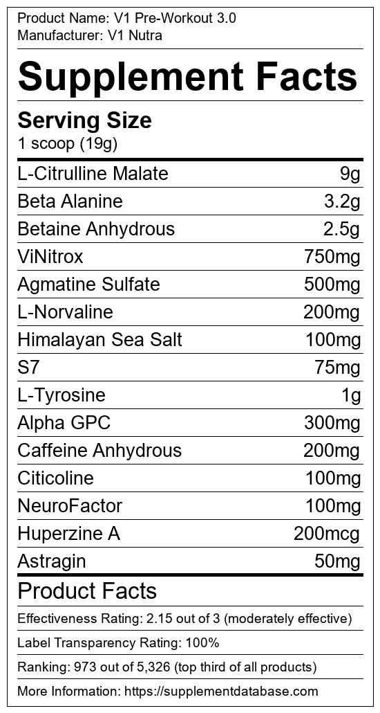 V1 Pre-Workout 3.0 is a pre-workout supplement manufactured by V1 Nutra. It ranks 433 out of 1,898 pre-workout supplements and earned an overall thumbs-up recommendation based on seven factors including nutrition label transparency, ingredients, dosing, claims, research rating, and ranking.