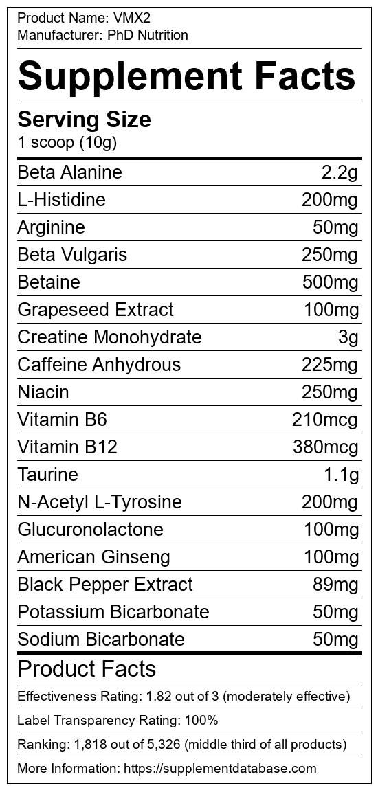 VMX2 is a pre-workout supplement manufactured by PhD Nutrition. It ranks 831 out of 1,898 pre-workout supplements and earned an overall thumbs-up recommendation based on seven factors including nutrition label transparency, ingredients, dosing, claims, research rating, and ranking.