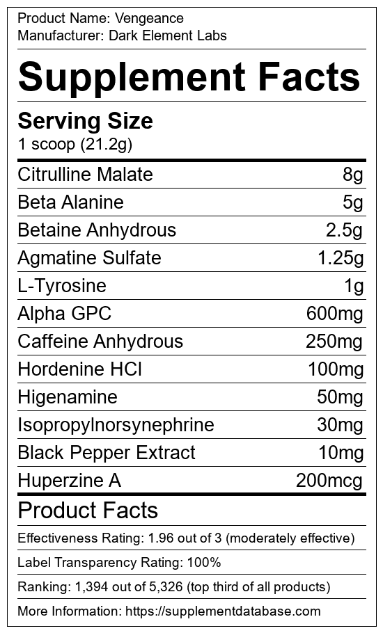 Vengeance is a pre-workout supplement manufactured by Dark Element Labs. It ranks 609 out of 1,898 pre-workout supplements and earned an overall thumbs-up recommendation based on seven factors including nutrition label transparency, ingredients, dosing, claims, research rating, and ranking.