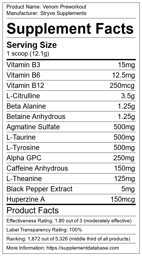 Venom Preworkout is a pre-workout supplement manufactured by Stryve Supplements. It ranks 864 out of 1,898 pre-workout supplements and earned an overall thumbs-up recommendation based on seven factors including nutrition label transparency, ingredients, dosing, claims, research rating, and ranking.