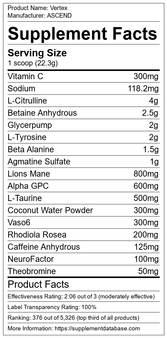 Vertex is a pre-workout supplement manufactured by ASCEND. It ranks 160 out of 1,898 pre-workout supplements and earned an overall thumbs-up recommendation based on seven factors including nutrition label transparency, ingredients, dosing, claims, research rating, and ranking.