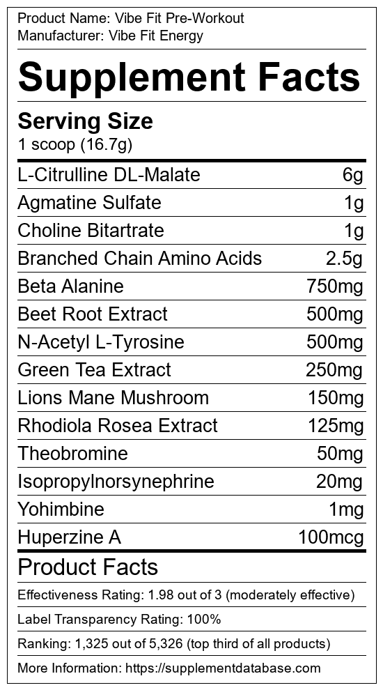 Vibe Fit Pre-Workout is a pre-workout supplement manufactured by Vibe Fit Energy. It ranks 589 out of 1,898 pre-workout supplements and earned an overall thumbs-up recommendation based on seven factors including nutrition label transparency, ingredients, dosing, claims, research rating, and ranking.