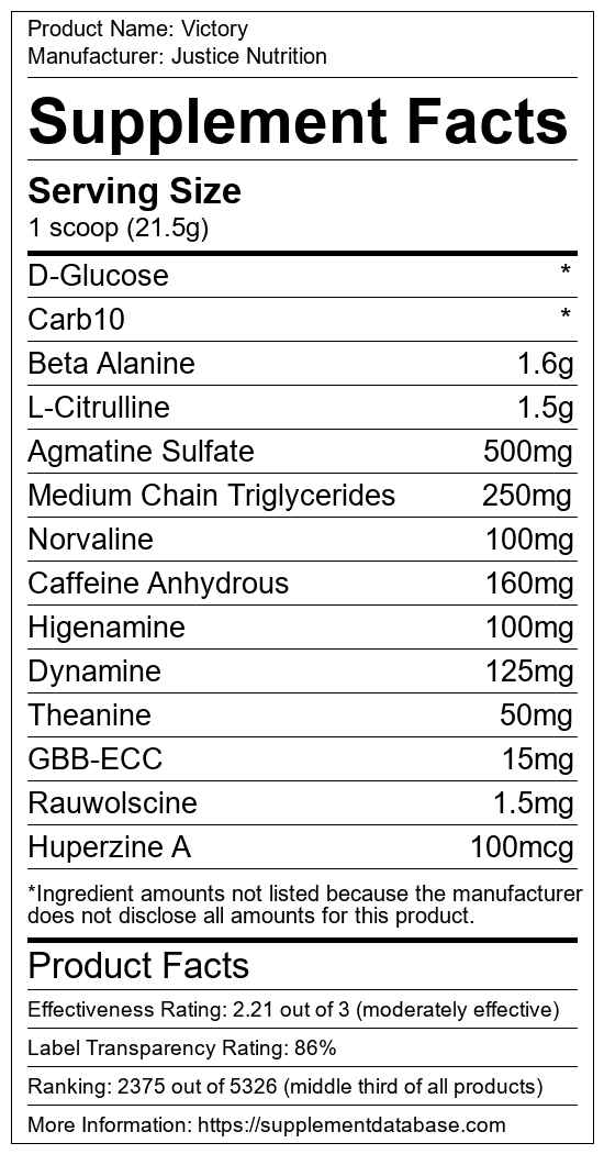 Victory is a pre-workout supplement manufactured by Justice Nutrition. It ranks 1,119 out of 1,898 pre-workout supplements and earned an overall thumbs-down recommendation based on seven factors including nutrition label transparency, ingredients, dosing, claims, research rating, and ranking.