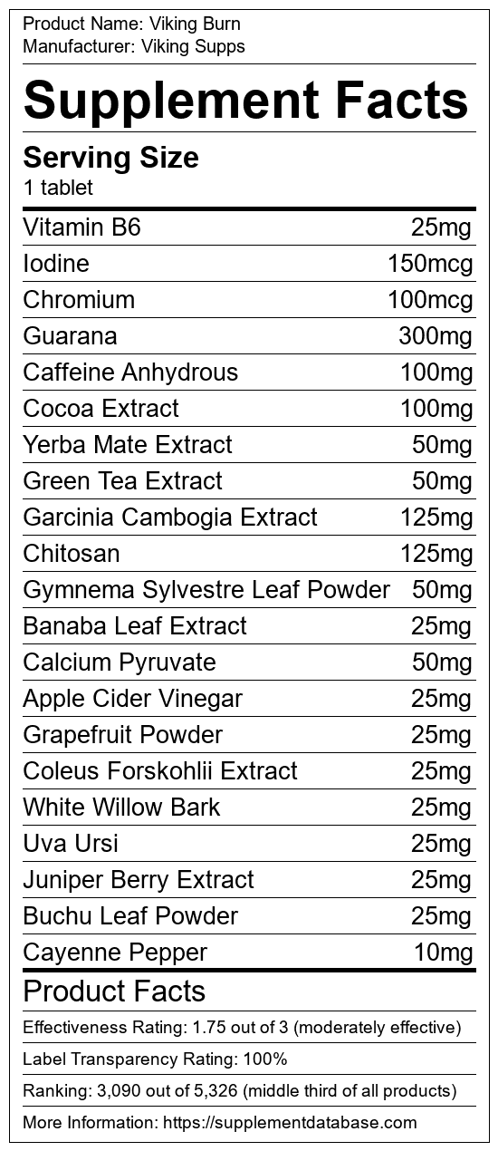 Viking Burn is a fat burning supplement manufactured by Viking Supps. It ranks 438 out of 719 fat burning supplements and earned an overall thumbs-down recommendation based on seven factors including nutrition label transparency, ingredients, dosing, claims, research rating, and ranking.