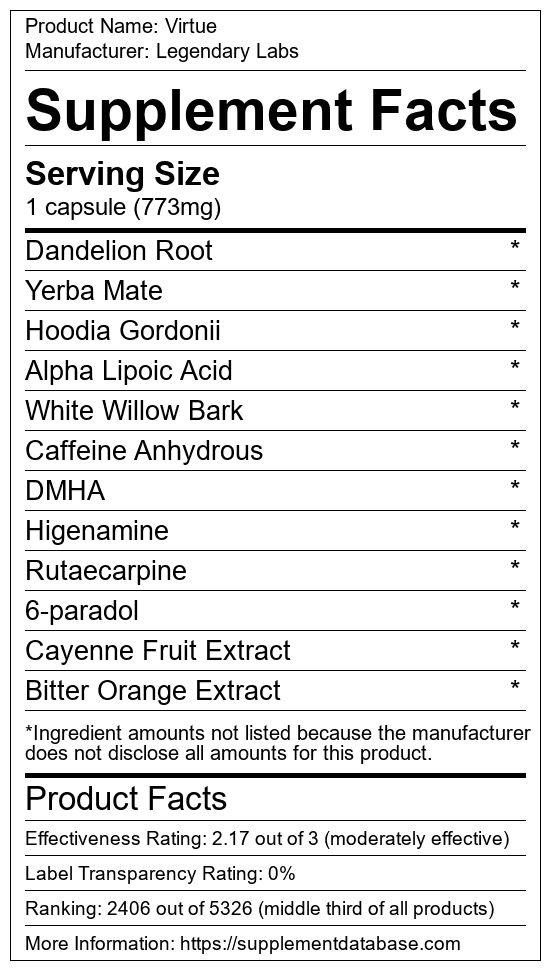 Virtue is a fat burning supplement manufactured by Legendary Labs. It ranks 266 out of 719 fat burning supplements and earned an overall thumbs-down recommendation based on seven factors including nutrition label transparency, ingredients, dosing, claims, research rating, and ranking.