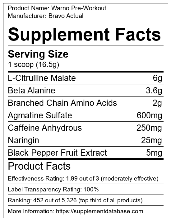 Warno Pre-Workout is a pre-workout supplement manufactured by Bravo Actual. It ranks 191 out of 1,898 pre-workout supplements and earned an overall thumbs-up recommendation based on seven factors including nutrition label transparency, ingredients, dosing, claims, research rating, and ranking.
