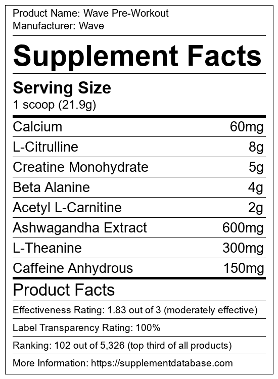Wave Pre-Workout is a pre-workout supplement manufactured by Wave. It ranks 58 out of 1,898 pre-workout supplements and earned an overall thumbs-up recommendation based on seven factors including nutrition label transparency, ingredients, dosing, claims, research rating, and ranking.
