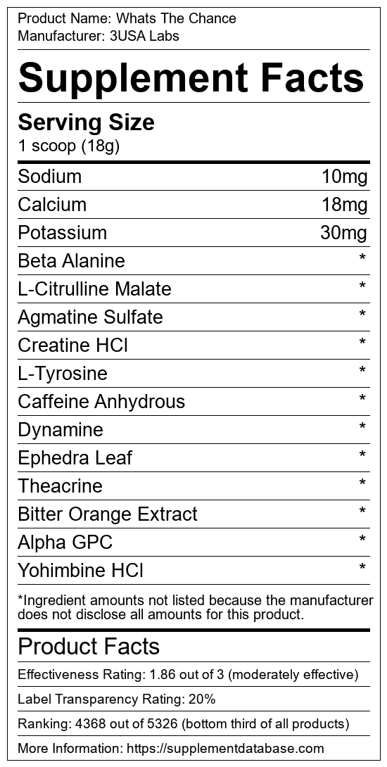 Whats The Chance is a pre-workout supplement manufactured by 3USA Labs. It ranks 1,748 out of 1,898 pre-workout supplements and earned an overall thumbs-down recommendation based on seven factors including nutrition label transparency, ingredients, dosing, claims, research rating, and ranking.