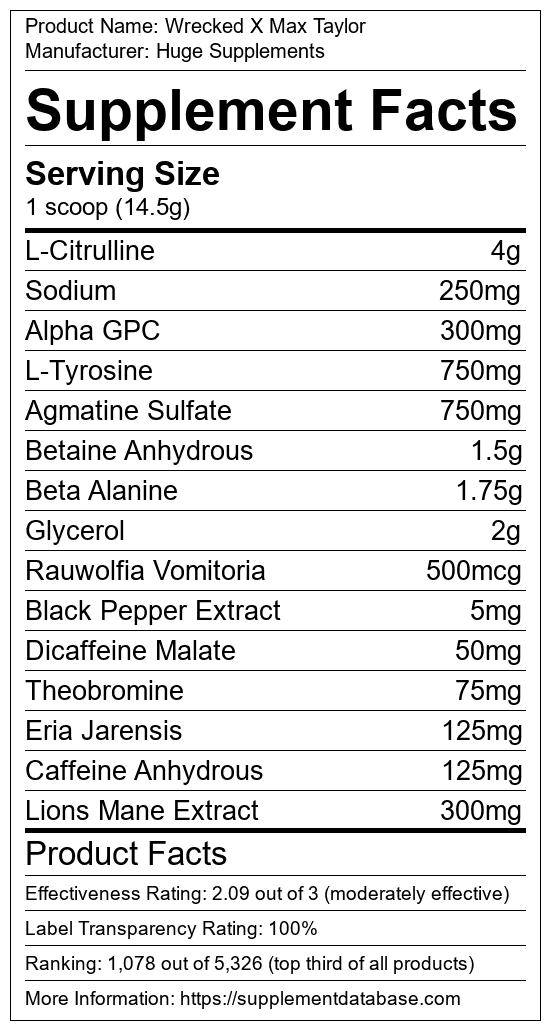 Wrecked X Max Taylor is a pre-workout supplement manufactured by Huge Supplements. It ranks 476 out of 1,898 pre-workout supplements and earned an overall thumbs-up recommendation based on seven factors including nutrition label transparency, ingredients, dosing, claims, research rating, and ranking.