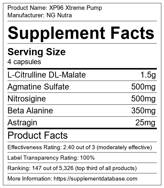 XP96 Xtreme Pump is a pump supplement manufactured by NG Nutra. It ranks 18 out of 322 pump supplements and earned an overall thumbs-up recommendation based on seven factors including nutrition label transparency, ingredients, dosing, claims, research rating, and ranking.