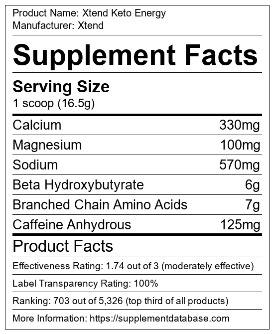 Xtend Keto Energy is a post-workout supplement manufactured by Xtend. It ranks 73 out of 515 post-workout supplements and earned an overall thumbs-up recommendation based on seven factors including nutrition label transparency, ingredients, dosing, claims, research rating, and ranking.