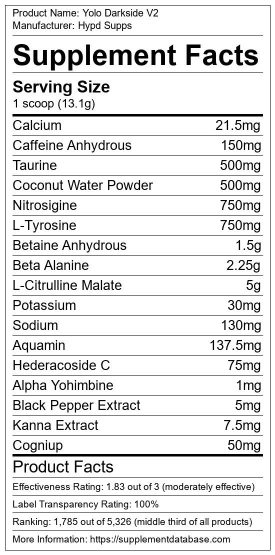 Yolo Darkside V2 is a pre-workout supplement manufactured by Hypd Supps. It ranks 812 out of 1,898 pre-workout supplements and earned an overall thumbs-up recommendation based on seven factors including nutrition label transparency, ingredients, dosing, claims, research rating, and ranking.