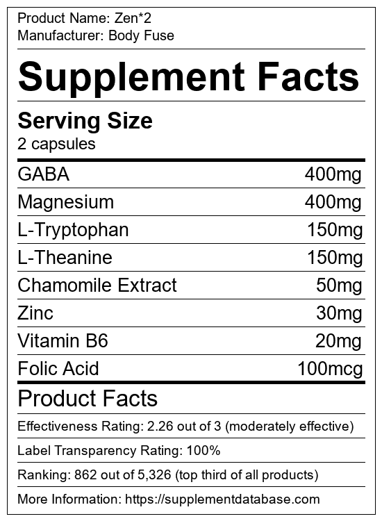 Zen is a mood enhancing supplement manufactured by Body Fuse. It ranks 17 out of 43 mood enhancing supplements and earned an overall thumbs-up recommendation based on seven factors including nutrition label transparency, ingredients, dosing, claims, research rating, and ranking.