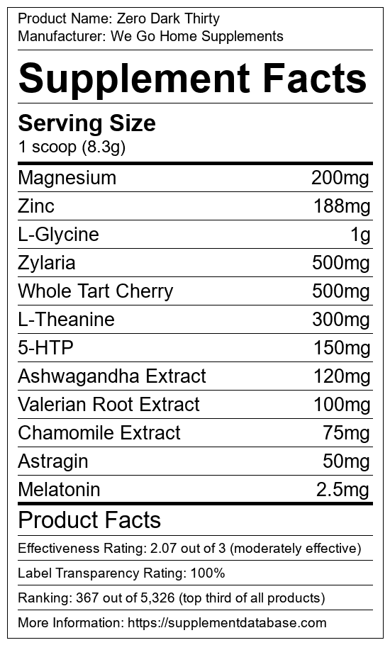 Zero Dark Thirty is a sleep aid manufactured by We Go Home Supplements. It ranks 36 out of 215 sleep aids and earned an overall thumbs-up recommendation based on seven factors including nutrition label transparency, ingredients, dosing, claims, research rating, and ranking.