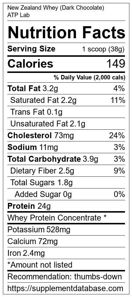 New Zealand Whey (Dark Chocolate) is a protein supplement manufactured by ATP Lab. It ranks 390 out of 466 protein supplements and earned an overall thumbs down recommendation based on several factors including effectiveness, research rating, ranking, protein content, and nutrition label transparency.