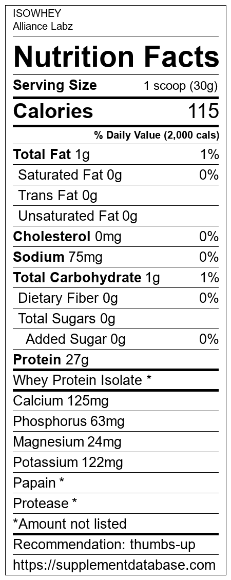 ISOWHEY is a protein supplement manufactured by Alliance Labz. It ranks 272 out of 466 protein supplements and earned an overall thumbs up recommendation based on several factors including effectiveness, research rating, ranking, protein content, and nutrition label transparency.