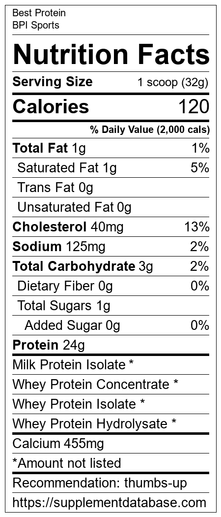 Best Protein is a protein supplement manufactured by BPI Sports. It ranks 160 out of 466 protein supplements and earned an overall thumbs up recommendation based on several factors including effectiveness, research rating, ranking, protein content, and nutrition label transparency.