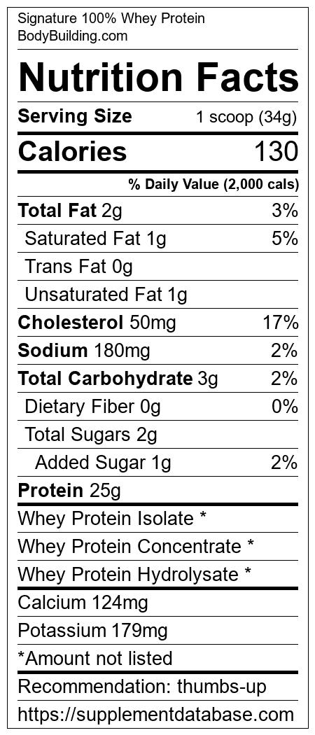 Signature 100% Whey Protein is a protein supplement manufactured by BodyBuilding.com. It ranks 63 out of 466 protein supplements and earned an overall thumbs up recommendation based on several factors including effectiveness, research rating, ranking, protein content, and nutrition label transparency.