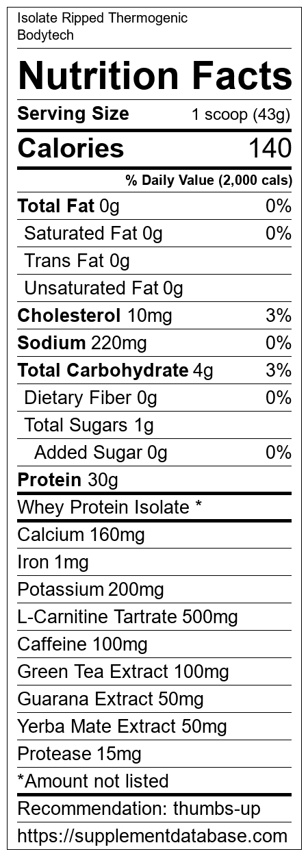 Isolate Ripped Thermogenic is a protein supplement manufactured by Bodytech. It ranks 103 out of 466 protein supplements and earned an overall thumbs up recommendation based on several factors including effectiveness, research rating, ranking, protein content, and nutrition label transparency.