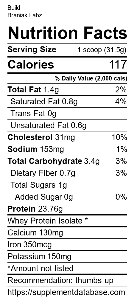 Build is a protein supplement manufactured by Braniak Labz. It ranks 155 out of 466 protein supplements and earned an overall thumbs up recommendation based on several factors including effectiveness, research rating, ranking, protein content, and nutrition label transparency.
