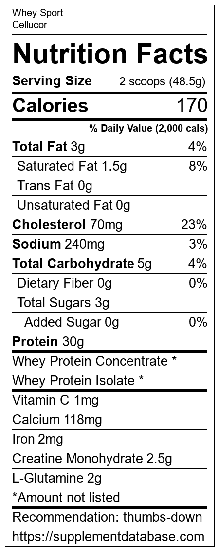 Whey Sport is a protein supplement manufactured by Cellucor. It ranks 446 out of 466 protein supplements and earned an overall thumbs down recommendation based on several factors including effectiveness, research rating, ranking, protein content, and nutrition label transparency.