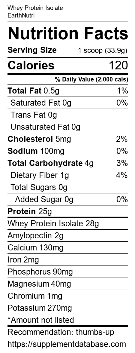 Whey Protein Isolate is a protein supplement manufactured by EarthNutri. It ranks 36 out of 466 protein supplements and earned an overall thumbs up recommendation based on several factors including effectiveness, research rating, ranking, protein content, and nutrition label transparency.