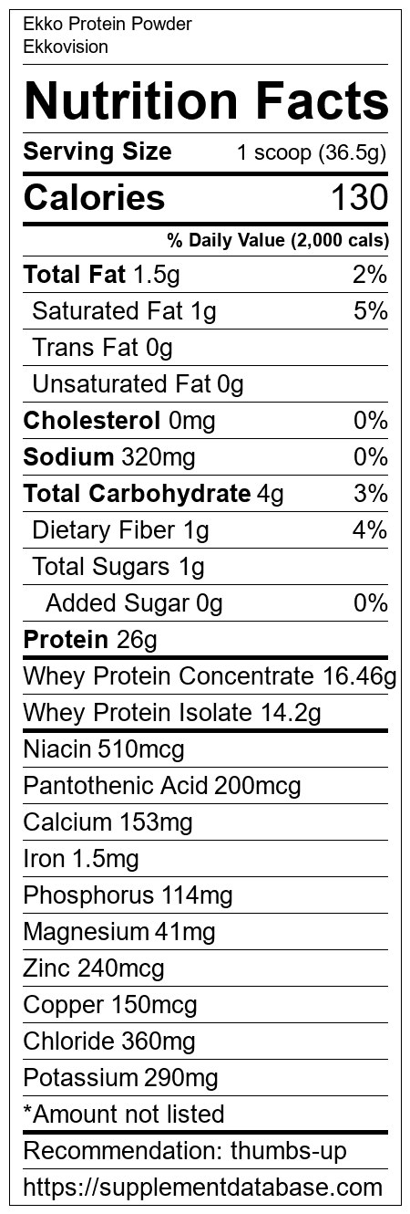 Ekko Protein Powder is a protein supplement manufactured by Ekkovision. It ranks 144 out of 466 protein supplements and earned an overall thumbs up recommendation based on several factors including effectiveness, research rating, ranking, protein content, and nutrition label transparency.
