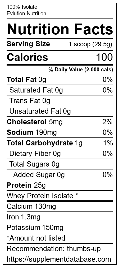 100% Isolate is a protein supplement manufactured by Evlution Nutrition. It ranks 173 out of 466 protein supplements and earned an overall thumbs up recommendation based on several factors including effectiveness, research rating, ranking, protein content, and nutrition label transparency.