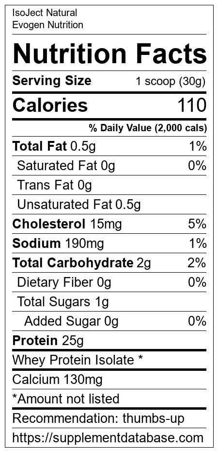 IsoJect Natural is a protein supplement manufactured by Evogen Nutrition. It ranks 106 out of 466 protein supplements and earned an overall thumbs up recommendation based on several factors including effectiveness, research rating, ranking, protein content, and nutrition label transparency.