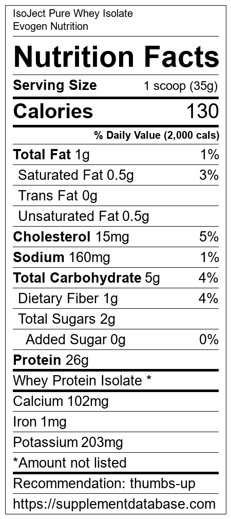 IsoJect Pure Whey Isolate is a protein supplement manufactured by Evogen Nutrition. It ranks 105 out of 466 protein supplements and earned an overall thumbs up recommendation based on several factors including effectiveness, research rating, ranking, protein content, and nutrition label transparency.