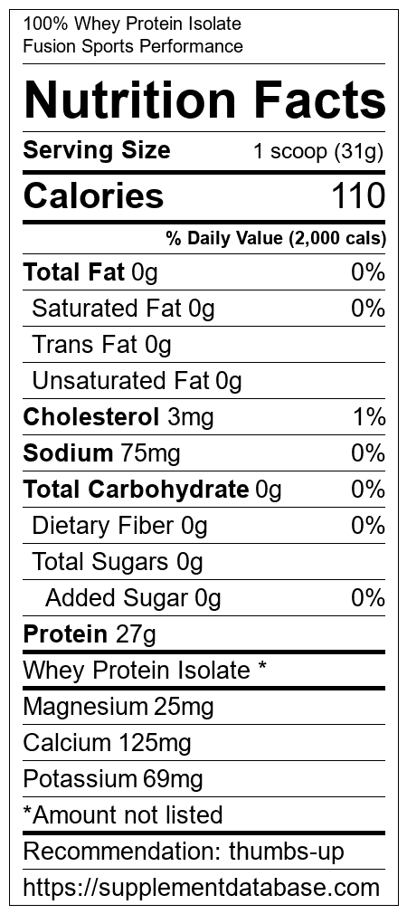 100% Whey Protein Isolate is a protein supplement manufactured by Fusion Sports Performance. It ranks 168 out of 466 protein supplements and earned an overall thumbs up recommendation based on several factors including effectiveness, research rating, ranking, protein content, and nutrition label transparency.