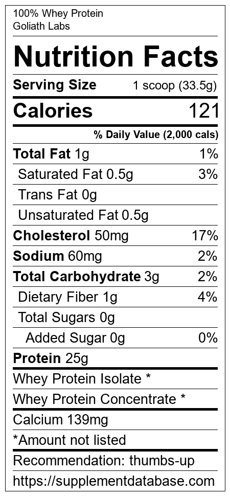 100% Whey Protein is a protein supplement manufactured by Goliath Labs. It ranks 169 out of 466 protein supplements and earned an overall thumbs up recommendation based on several factors including effectiveness, research rating, ranking, protein content, and nutrition label transparency.